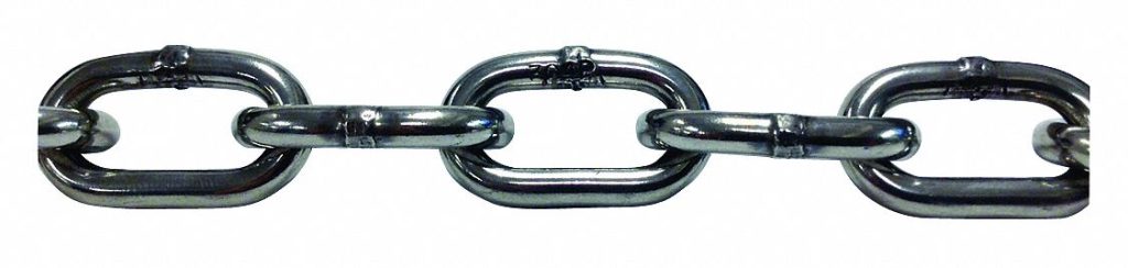 Link Inside Width: 1/2 in, Link Inside Length: 1 in, Material: 304 Stainless Steel, Brand: PEWAG, Overall Length: 100 ft, Chain Trade Size: 5/16 in, Working Load Limit: 2,850 lb, Finish: Plain