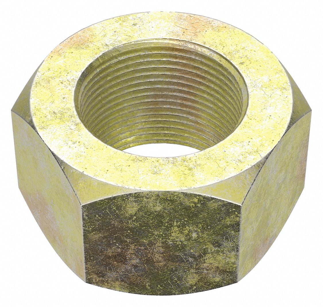 Hex Nut: 1 1/2″-12 Thread, 2 1/4 in Hex Wd, 1 9/32 in Hex Ht, Steel, Grade 8, Zinc Yellow, 5 PK