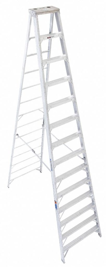 Series: 400, Included Features: Metal Top with Storage, Shoe Type - NEW: Slip-Resistant, Brand: WERNER, Base Width: 35.2 in, Step Spacing: 12 in, Max Standing Height: 9.6 ft, Base Spread: 30.1 in, Ladder Size: 12 ft, Ladder Type: A-Frame Stepladder, Ladder Material: Aluminum, Load Capacity: 375 lb, Number of Steps: 11, Step Depth: 3 in, Tread Type: Ribbed, Weight: 16 lb, ANSI Duty Rating: Type IAA, Max Reach Height: 16.1 ft