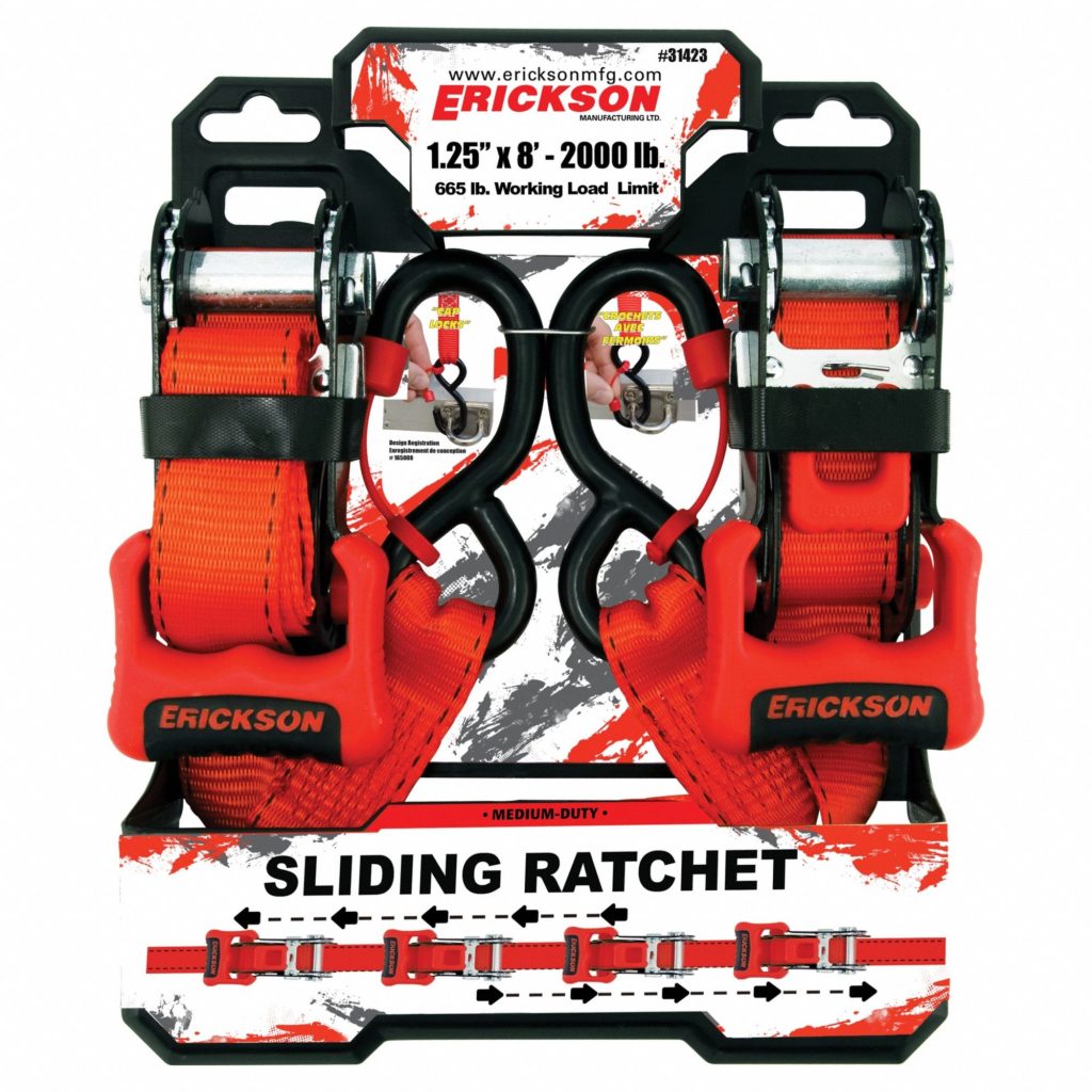 Brand: ERICKSON, Tie Down Material: Polyester, Features - NEW: Padded Handle, Adjustment Type: Ratchet, Color: Red, End Type: S-Hook, Tensile Strength: 2,000 lb/in, End Material: Steel, Working Load Limit: 665 lb, Overall Width: 1-1/4 in, Overall Length: 8 ft, Reinforcement Properties - NEW: General Purpose