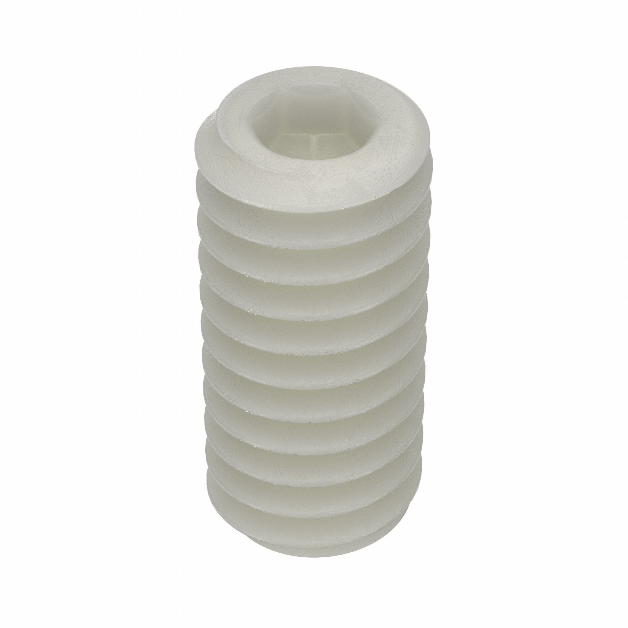 Socket Set Screw: #8-32 Thread Size, 3/8 in Overall Lg, Flat pt, Nylon, Plain, Socket, 50 PK