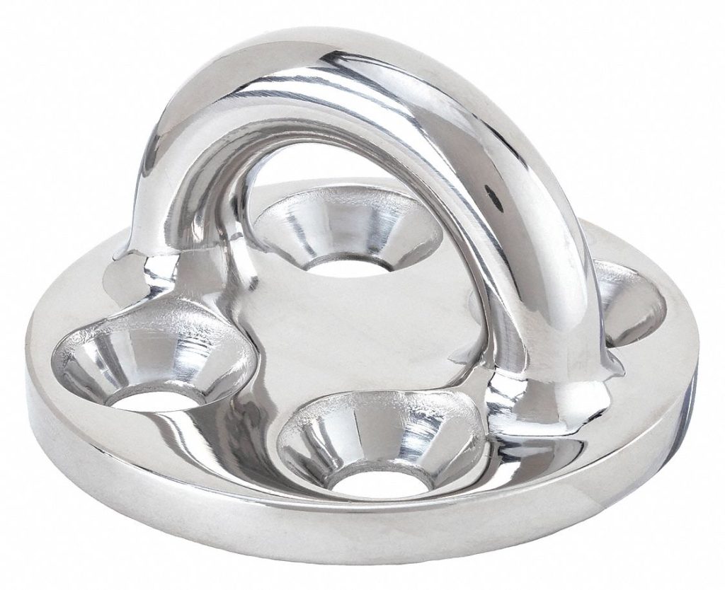 Material: Stainless Steel, Number of Mounting Holes: 4, Ring Thickness: 3/8 in, Working Load Limit: 6,600 lb, Mounting Hole Diameter: 2-1/4 in, Base Dimensions (W x L x D): 2-1/4 in x 2-1/4 in x 2 in