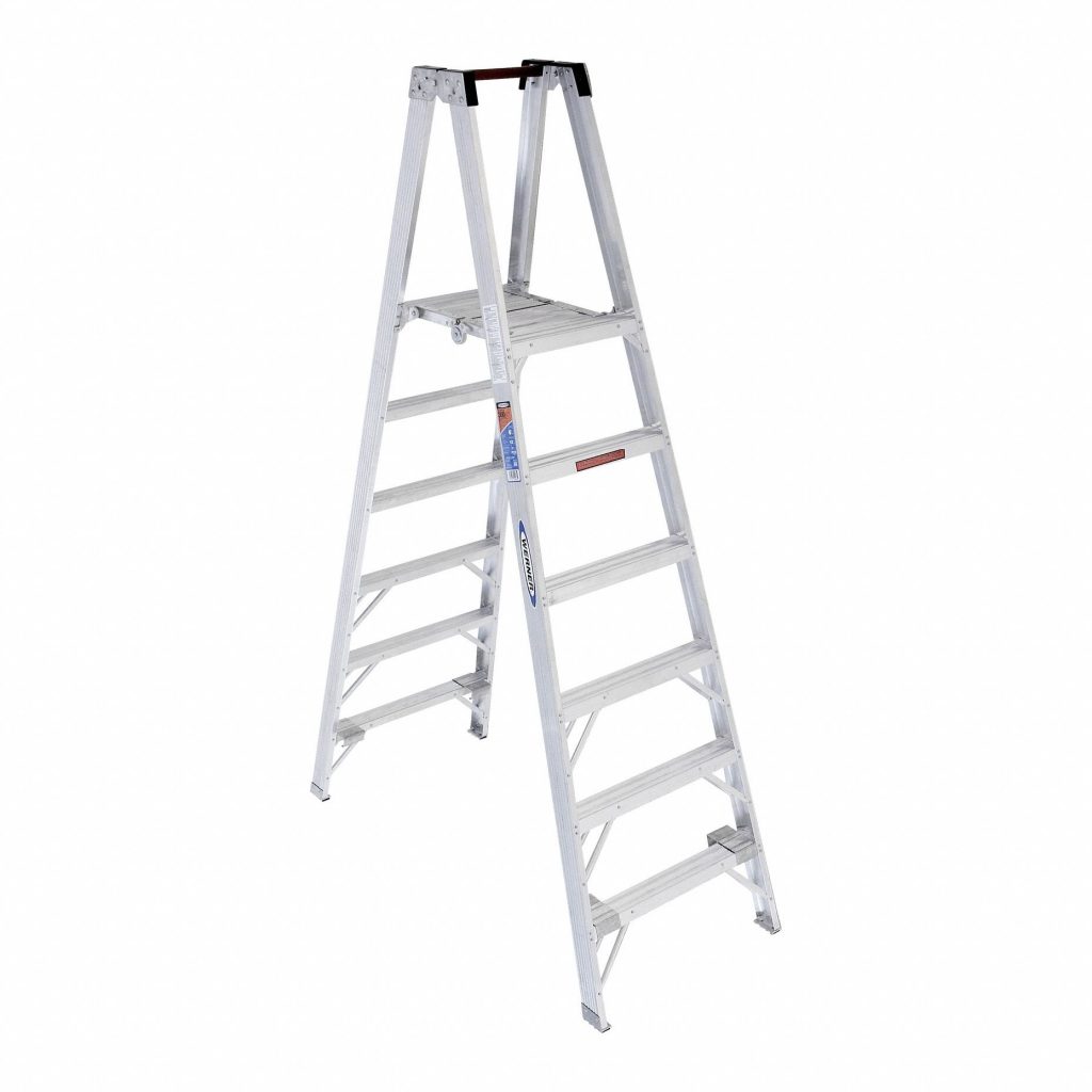 Max Standing Height: 7.7 ft, Brand: WERNER, Included Features: Guard Rail, Max Reach Height: 14 ft, Ladder Size: 8 ft, Number of Steps: 8, Weight: 47 lb, Platform WxD: 12.8 in x 22 in