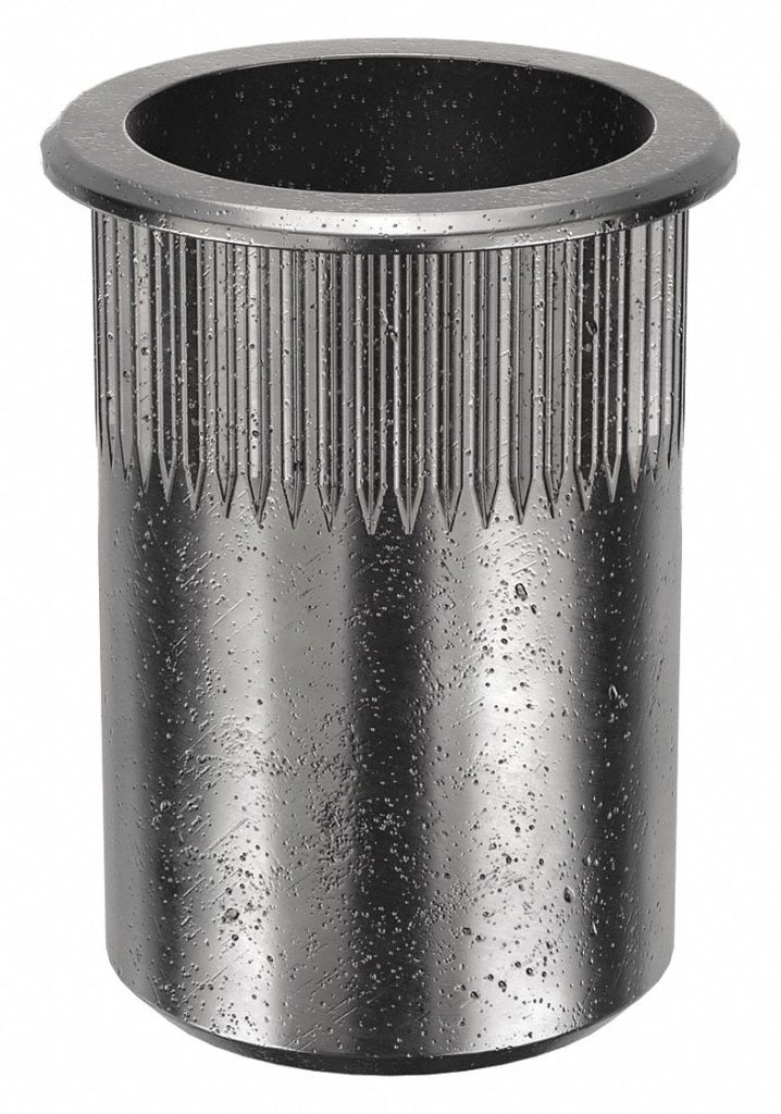 Installed Length: 5/16 in, Drill Bit Size: 19/64 in, Maximum Material Thickness: 0.13 in, Minimum Material Thickness: 0.02 in, Thread Fit: 2B, Thread Type: Coarse, End Type: Open, Overall Length: 1/2 in, Thread Size: #10-24, Material Grade/Class: 1008/1010, Flange Diameter: 0.34375 in, Flange Thickness: 0.019 in, Body Type: Round, Insert Nut Type: Rivet Nut, Insert Diameter: 19/64 in, System of Measurement: Inch, Body Texture: Knurled, Maximum Hole Diameter: 0.297 in, Material: Steel, Material Type: Steel