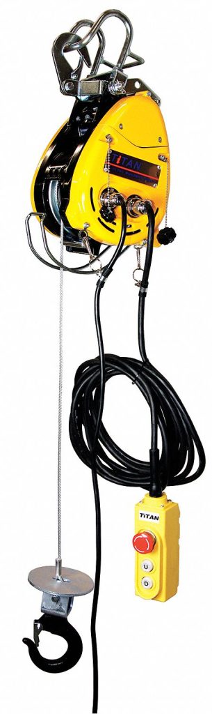 Lifting Hook Type: Hook with Safety Latch, Brand: OZ LIFTING PRODUCTS, Headroom: 26 in, Lift Length: 90 ft, Max Current Draw: 17.5 A, Speed Programmability: Non-Programmable, Lifting Capacity: 500 lb, Motor Horsepower: 1-3/4 hp, Operating Voltage: 115V AC, Lift Speed: 75 fpm